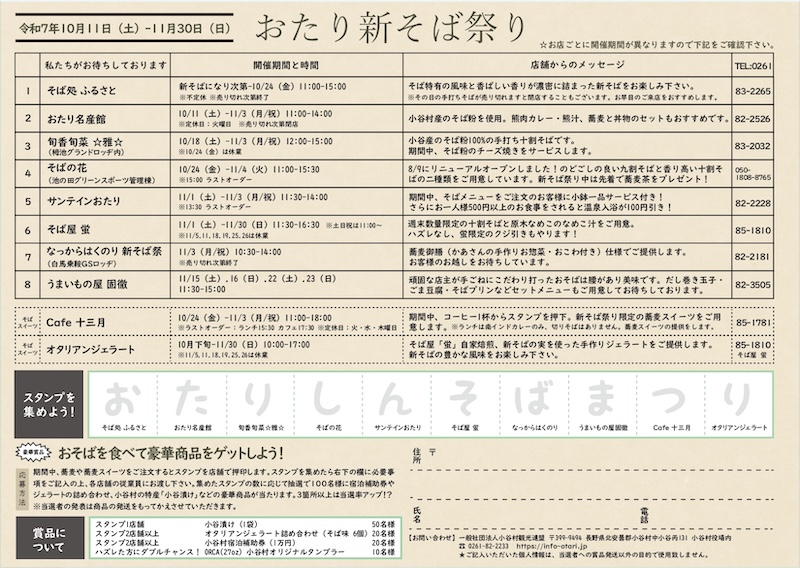 内容:小谷村内の各店舗で新そばやそばスイーツを提供。スタンプを集めて抽選に参加可能。宿泊補助券やジェラート詰め合わせなど豪華賞品をご用意しています。