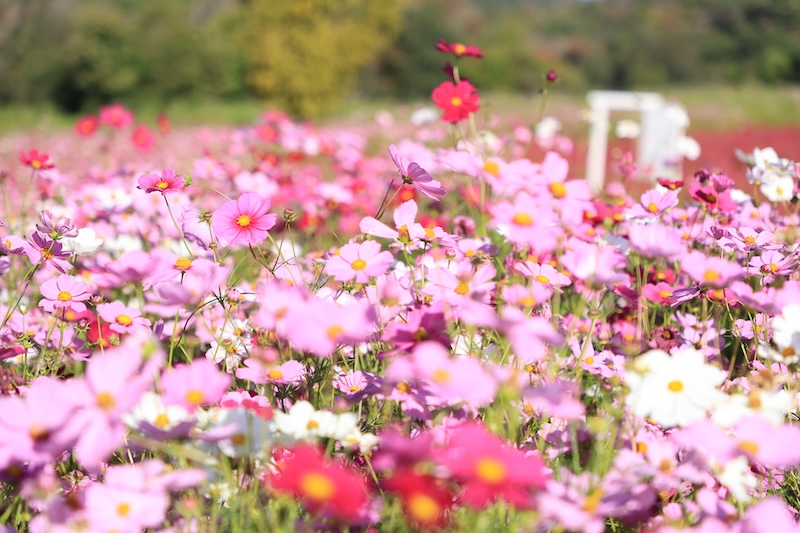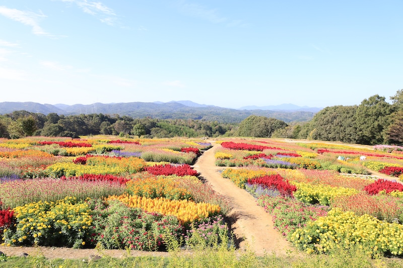 Flower village 花夢の里では「コキアとコスモスの丘」を開催中です。コキアが赤く色づき始めました。園内の花々も見ごろを迎えています。これから色づきが進むコキアと色鮮やかなパッチワークの丘をお楽しみください。10月12日(日)、19日(日)は開園時間を1時間延長し18時まで開園いたします。