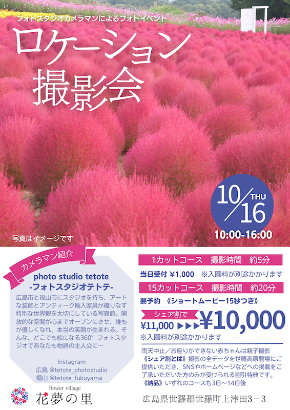 フォトスタジオカメラマンによる撮影イベントです。秋のコキア畑では初の開催です。コキア畑で印象的な一枚を残しませんか。予約なしのコースもございます。