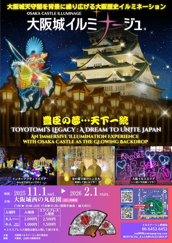 一般社団法人 日本イルミネーション協会は、「大阪城イルミナージュ」を2025年11月1日から開催いたします。毎年10万人以上が訪れる日本最大級のイルミネーションイベントで、今年は「豊臣の夢…天下一統」をテーマに展開。今年ならではの演出や新規企画を多数盛り込み、光と歴史、幻想と文化が融合する特別な冬を演出します。公式サイトにてチケット販売を開始しております。