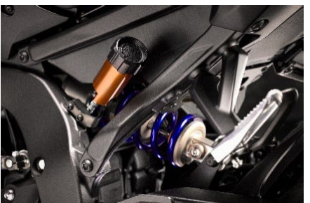 新構造のKYB 製サスペンションを「YZF-R9」専用にセッティングし、前後に採用しました。フロントには、2025 年モデルのフラッグシップ「YZF-R1」と同じ、インナー径φ43mm・ストローク量120mm の倒立式サスペンションを搭載。イニシャル調整の他、減衰力は右が伸び側、左が圧側を受け持つ左右独立方式を採用。圧側はさらに高速と低速の2WAY セッティングが可能です。ベースバルブを追加しており、ボトム部分へ流入するオイルを制限、もしくは抑止することによって、シリンダー内の圧力を最適化。ストローク時の応答性を高めています。リアには、極低速減衰力発生構造を持つ新設計のリンク式モノクロスサスペンションを装備。イニシャルの他、伸び側減衰力、圧側減衰力、車高の調整機構を備えています。ピストンロッドの先端に微低速領域を司るバルブを加え、フリクション領域に近い部分の減衰力をコントロール。バネ下の不要な動きを抑え、上質なストローク感と接地感に貢献します。なお、フロントのアウターおよびリアのリザーバータンクには、外観品質に優れ、耐摩耗性に優れるカシマコートを施しています。