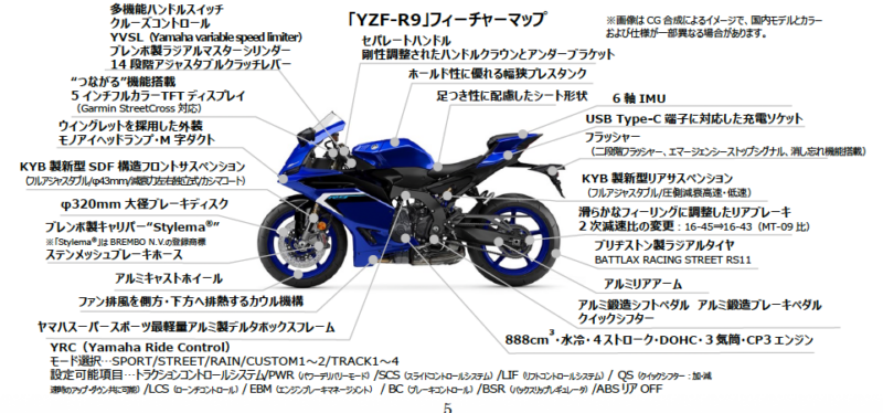 ライダーが自身の好みや路面状況にあわせて、エンジンフィーリングや各種電子デバイスの介入度を選択できる機能「YRC(Yamaha Ride Control)」を搭載。あらかじめプリセットされた3 種のパターン(SPORT/STREET/RAIN)の他、2 種のカスタマイズ枠(CUSTOM1~2)、またTRACK モードでは4 種の枠(TRACK1~4)から、シーンに応じてモード選択が可能です。走行をサポートする制御設定可能な項目は、クルーズコントロールシステムや設定した速度に最高速度を制限できる「YVSL(ヤマハバリアブルスピードリミッター)」やトラクションコントロールシステムの他、PWR(パワーデリバリーモード)、SCS(スライドコントロールシステム)、LIF(リフトコントロールシステム)、 QS(クイックシフター:加減速時のアップ/ダウン共に可能)、LC(ローンチコントロール)、EBM4(エンジンブレーキマネージメント)、BC(ブレーキコントロール)、BSR(バックスリップレギュレータ)、ABS リアOFF です。