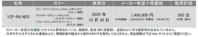 【ヤマハ】スーパースポーツモデル「YZF-R9 ABS」新発売