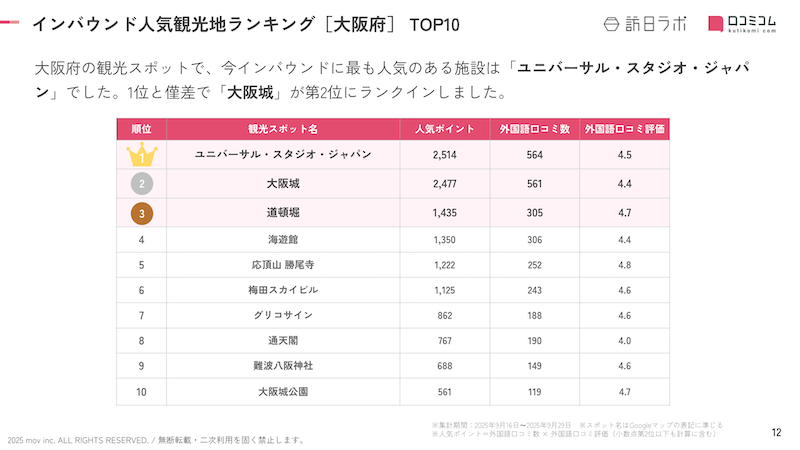 - 調査対象:訪日ラボが独自に選出した大阪府の観光スポット(計1,629箇所)