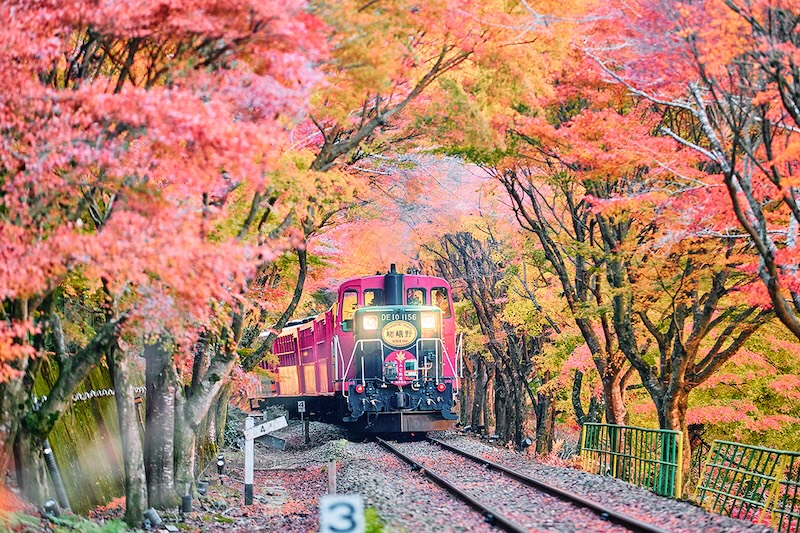 嵯峨野トロッコ列車では、保津川渓谷を走る列車から紅葉の渓谷美を堪能できます。木製の座席や裸電球がともるレトロ感漂う車両でゆったりと進み、車窓からは赤や黄に染まる山々が広がり、秋の風景をじっくり楽しめます。夜には沿線がライトアップされる「光の幻想列車」が運行され、昼間とは異なるロマンティックな景色が見られます。