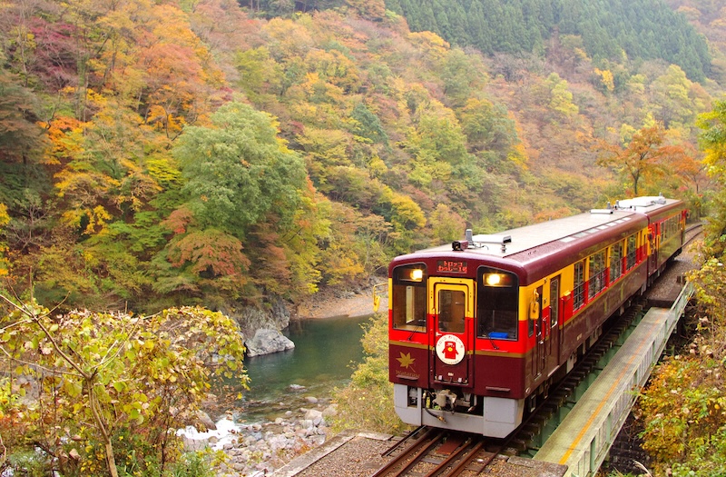 わたらせ渓谷鐵道では、関東屈指の渓谷美と鉄道が融合した秋の絶景が満喫できます。窓ガラスのないトロッコ列車「トロッコわっしー号」からは、秋風を感じながら、紅葉に染まる山並みと渡良瀬川が楽しめます。沿線には登録有形文化財にもなっている木造駅舎の駅も点在し、レトロな雰囲気が漂います。特に「古路瀬渓谷」や「沢入駅〜原向駅」間は写真映え抜群、標高差により紅葉が長く楽しめるのも魅力です。