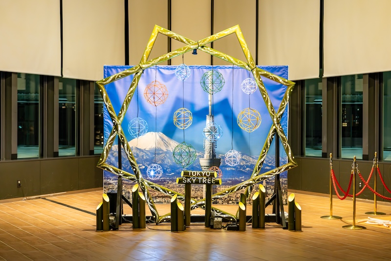 東京スカイツリーのパネルをバックにした竹あかりのオブジェがお客様をお見送りします。