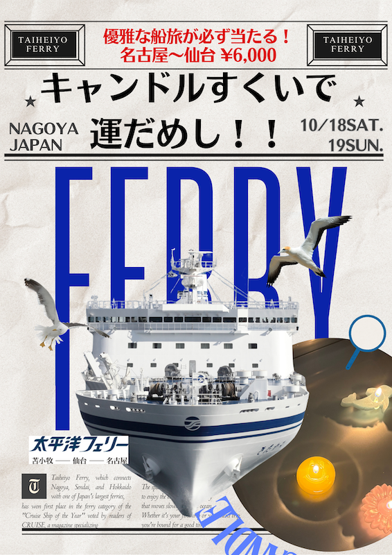 本企画は、1回6,000円(税込)で、名古屋~仙台間の片道乗船券が必ず当たる、大変お得な抽選販売会です。水に浮かんだ色とりどりのキャンドルを紙のポイですくう「キャンドルすくい」に挑戦いただき、すくったキャンドルの裏面に記載された等級の乗船券をお渡しします。