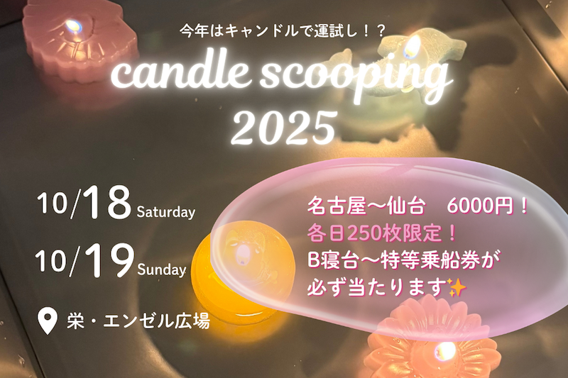 名古屋~仙台間の片道乗船券(最大20,000円相当)が、必ず6,000円で手に入るチャンス!名古屋まつりで人気のフェリー乗船券販売企画が、今年は話題の「キャンドルすくい」になって登場します!