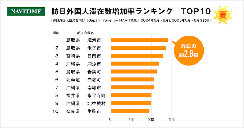 株式会社ナビタイムジャパンのNAVITIMEデータ分析チームは、訪日外国人観光客向けのナビゲーションアプリ『Japan Travel by NAVITIME』の利用状況から、2025年の夏に訪日外国人旅行者の滞在が増加している地域の分析結果を発表いたします。