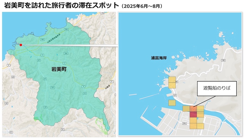 岩美町での滞在エリアを確認すると、浦富海岸島巡り遊覧船の船のりば周辺での滞在が確認できました。