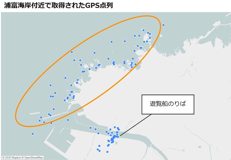 浦富海岸付近で取得されたGPS点列を確認すると遊覧船に乗ってクルージングを楽しんでいる様子が伺えます。