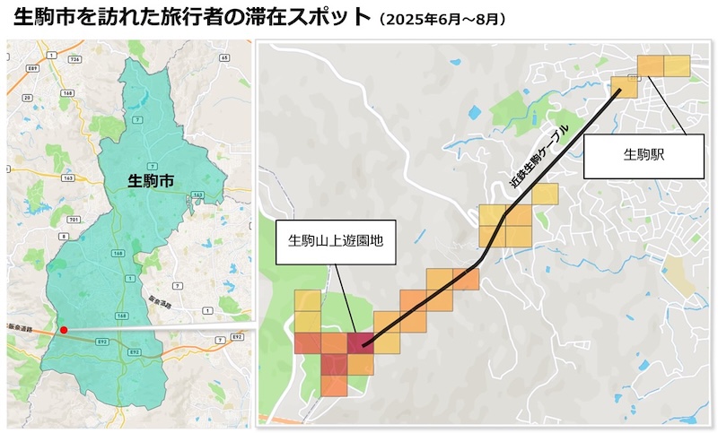 生駒市を訪れた旅行者の滞在スポットを確認すると、生駒駅から近鉄生駒ケーブルを利用して、生駒山上遊園地へ滞在する様子が見られました。