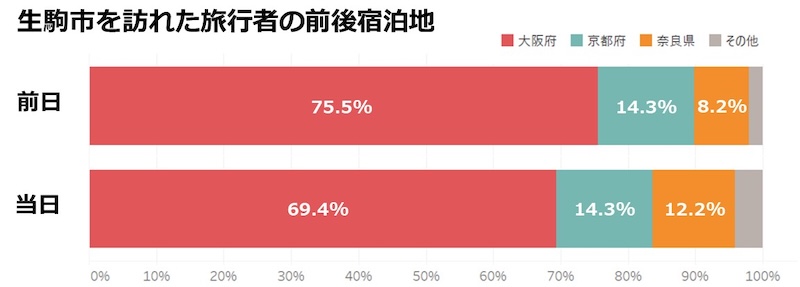 生駒市に滞在した旅行者の前後の宿泊地を確認すると、いずれも大阪府での宿泊が多く、大阪府の滞在中に日帰りで生駒市を訪れていることがわかります。