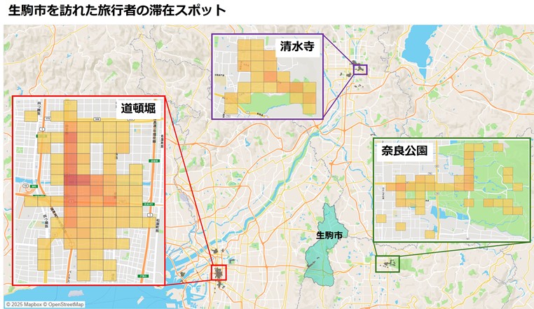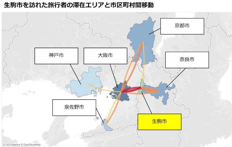 生駒市を訪れた旅行者は他にも、道頓堀(大阪市)、奈良公園(奈良市)、清水寺(京都市)といった関西の有名スポットを一緒に回っていることも確認できました。