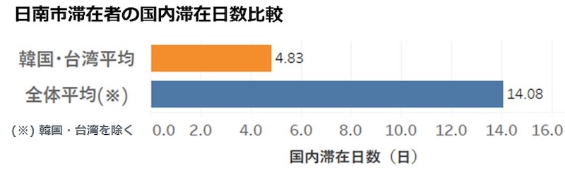 国内に滞在した旅行者の滞在日数に着目すると、日南市に滞在した旅行者全体の平均は約14日であるのに対し、韓国・台湾からの旅行者の平均は約4.8日と大きな差が見られました。宮崎空港には韓国・台湾からの直行便が運航されており、比較的短い滞在日数でも訪問される環境にあることが推測されます。