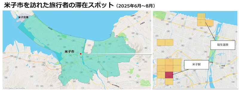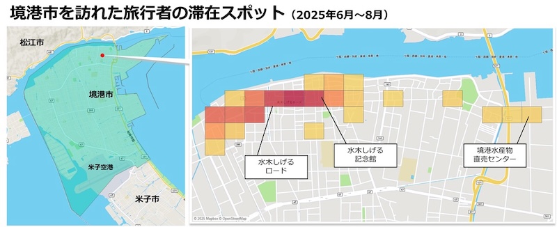 2025年夏の訪日外国人滞在数増加率ランキングの1位は鳥取県の境港市でした。境港市での滞在エリアを確認すると、漫画家・水木しげる氏が描く妖怪の世界を楽しめる水木しげるロード周辺での滞在が多いことが確認できたほか、境港水産物直売センターでも滞在が見られました。