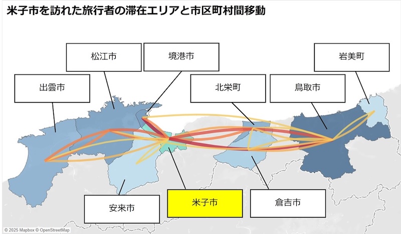 米子市に滞在した旅行者の滞在期間を確認すると、米子市内平均滞在日数は2. 29日で、同期間の鳥取県・島根県の山陰2県における市町村の平均滞在日数(※3)1. 57日と比較して長くなっています。また、米子市への旅行者が前後に滞在した市区町村を確認すると、鳥取県の鳥取市、境港市、北栄町、島根県の松江市、出雲市に多く滞在していることがわかりました。これらのことから、米子市が山陰観光における滞在の拠点となっていることが見て取れます。