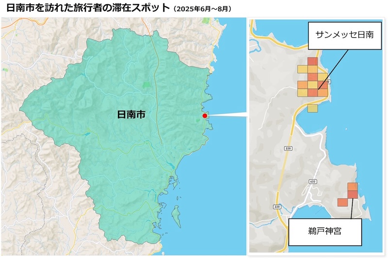 日南市での滞在エリアを確認すると、サンメッセ日南、鵜戸神宮での滞在が多いことを確認できました。