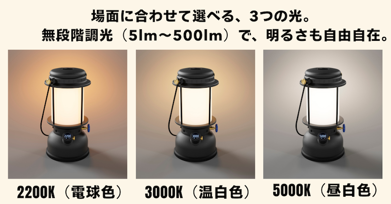 最大500ルーメンの明るさは、無段階に調整可能。暖かく揺らめくような2200K(電球色)、リラックス感のある3000K(温白色)、そして実用的な5000K(昼白色)と、3段階の色温度切替えに対応。