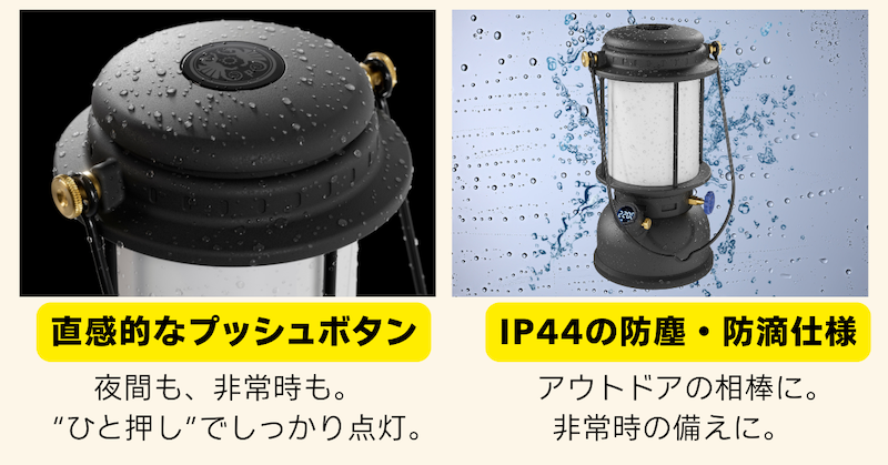 トップのプッシュボタンを1秒押すだけの簡単操作で点灯。IP44準拠の防滴仕様により、突然の雨や湿気にも対応し、屋外・室内問わず安心して使用できます。