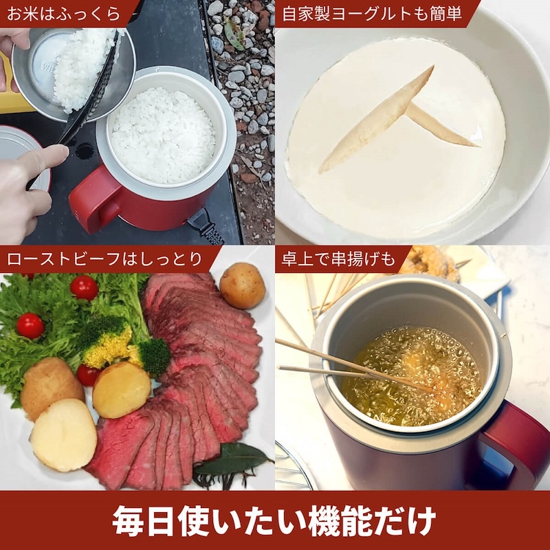 もちろんキャンプだけでなく、お弁当用に少量のご飯を炊いたり、「炊く」「発酵」「低温」「揚げ物」の4つの機能を搭載しているため、サブの調理家電として日常使いにもぴったりです。