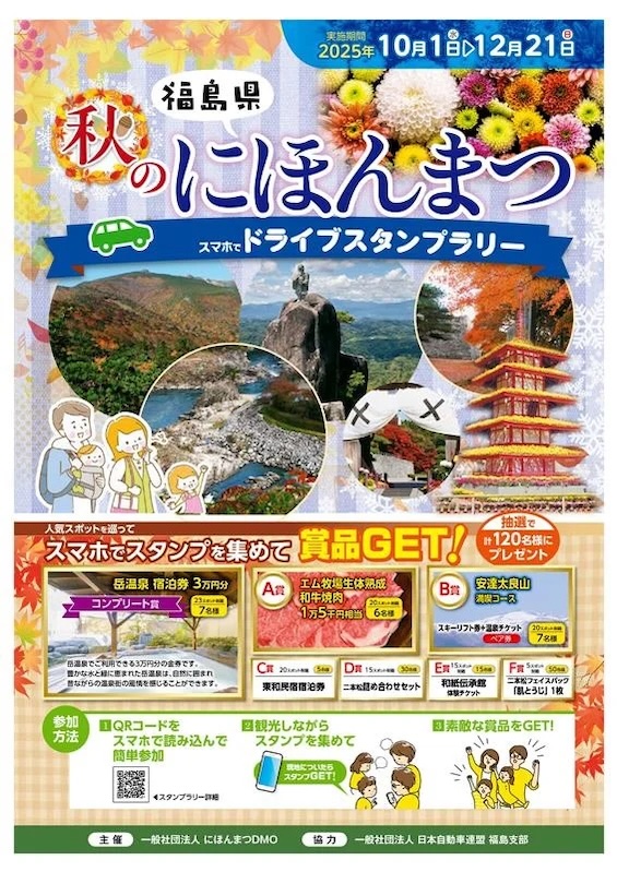 JAF(一般社団法人日本自動車連盟)福島支部(支部長 大沼 健弘)は、2025年10月1日(水)から開始した「秋のにほんまつドライブスタンプラリー2025」に協力しています。スタンプラリーを通じて、福島県二本松市の魅力を伝え、ドライブを通じた観光振興をはかります。