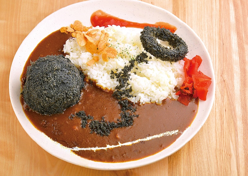 月形ならではの個性派カレー。かつて月形にあった樺戸集治監の鐡丸(テツガン)と足かせを、竹炭入りの黒いパン粉を使用した黒いコロッケとオニオンリングで表現しています。おすすめのお土産は「まんまる納豆」(150円)で、地元産「ユキホマレ」を100%使用したふっくら柔らかい食感が特徴です。