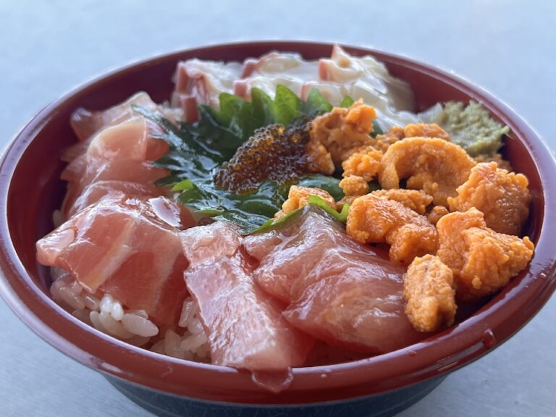 鹿部を中心に、その日漁港から直接仕入れた新鮮なネタを3~5種類盛り合わせた1日限定20食の海鮮丼。日替わりなので、何がのっているかはお楽しみ!また、車で約30分の位置に温泉施設があり、開放感たっぷりの露天風呂や、フィンランドスタイルのセルフロウリュ可能なサウナなど多彩なお風呂を堪能できます。