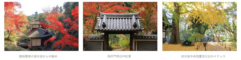 秋の三溪園は黄色や赤に色づいた木々が園内の古建築をより一層輝かせ、黄金色に輝くイチョウや色鮮やかなカエデやモミジが美しく、しっとりとした古都の風情が漂います。