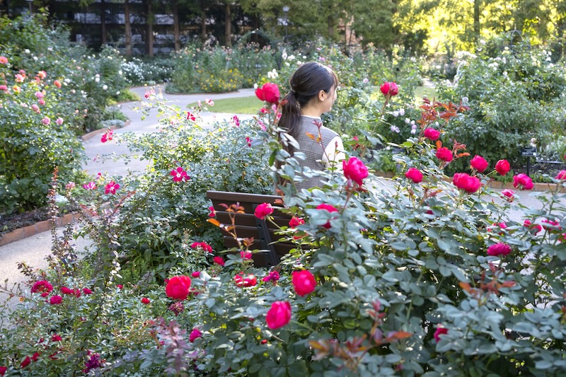 園内が秋のバラで華やかに彩られ、深い色合いと豊かな香りが11月中旬ごろまで楽しめる