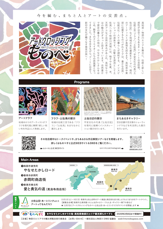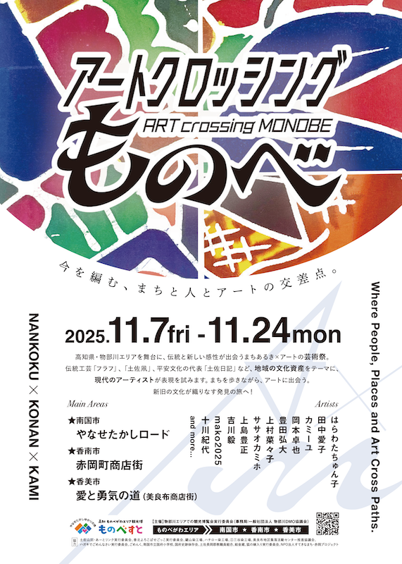 物部川エリアでの観光博覧会実行委員会は、高知県物部川流域(香美市・南国市・香南市)を舞台にした観光博「ものべすと」の一環として、伝統と新しい感性が出会う、まちあるき×アートの芸術祭「アートクロッシングものべ」 を2025年11月7日(金)から24日(月・休)まで開催します。