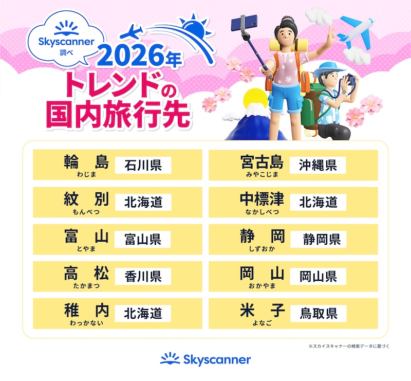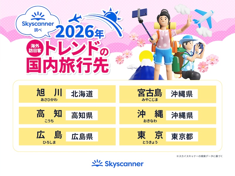 世界中の航空会社・旅行会社・ホテルなど約1,200のウェブサイトから最適な旅行プランを提供する” グローバル旅行アプリ” Skyscanner Japan株式会社は、2026年にブレイクが予想される注目の旅行先を紹介する「2026年トレンドの旅行先ランキング」を発表しました。