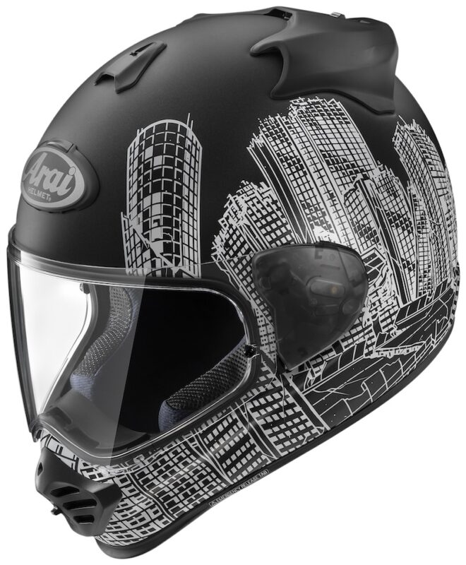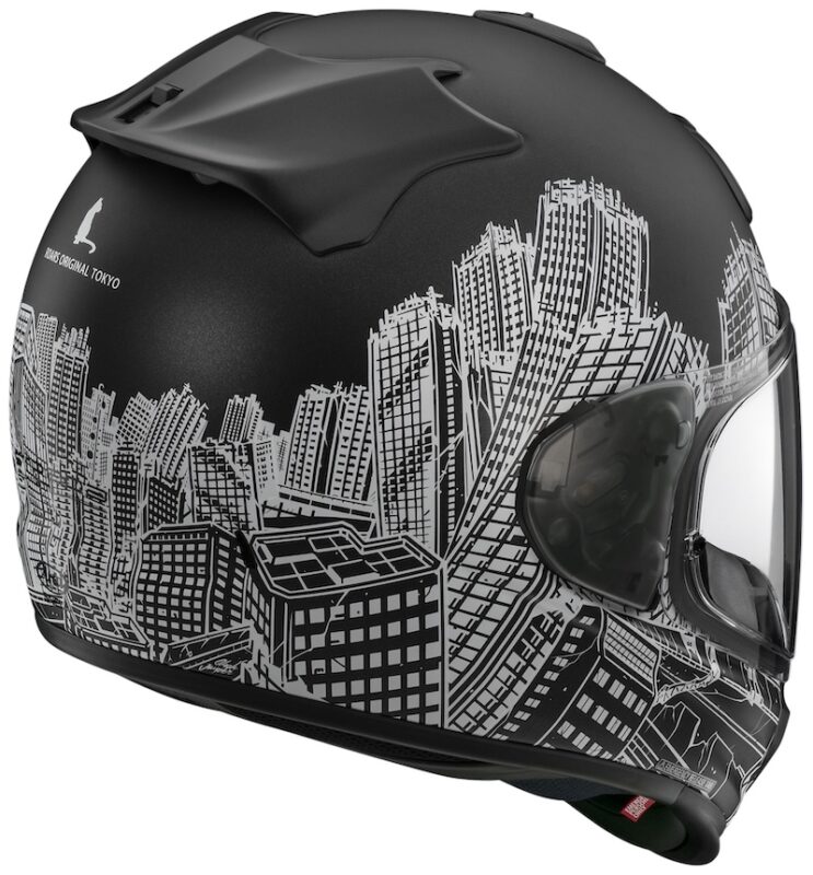 「かわす性能」を高めた「卵形」フォルムからなる丸く滑らかで強靭な帽体が生む安心感。スタイルだけではない真の実力派にリスタイルされたストリートモデル「TXストラーダ」第一弾のカラーリングモデル「TXストラーダ・ロアーズ」。東京・西麻布に店舗を構えるおしゃれライダーには言わずと知れたアパレルブランド「ロアーズオリジナル」にて限定で販売されていた「ラパイドNEOロアーズ黒」のデザイン、モノトーンを基調とした色使いで描かれた都会のビル群イラストをTXストラーダにも落としこみました。