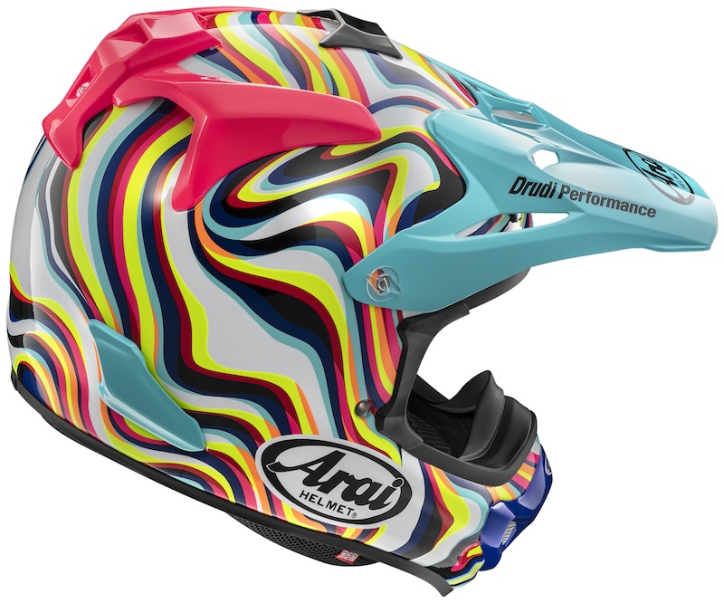 「アライの考える理想のフォルム「卵形」からなる頭を護る安全性能「かわす性能」を全て取り入れながら、プロライダーの信頼と集中力を妨げない機能で、闘志あふれるアグレッシブなスタイリングの本格的オフロードモデル「V-CROSS4」をベースとしたNEWカラーリングモデル「V−CROSS4ストリーム」。オフロードライディングの派手で激しいイメージを力強く表現し、オフロードコースのクネクネとしたタイトな連続コーナーをスムーズな流れに乗って走る抜ける様を華麗にカラフルにイメージした「ピンク」「ブルー」の2色展開になっています。