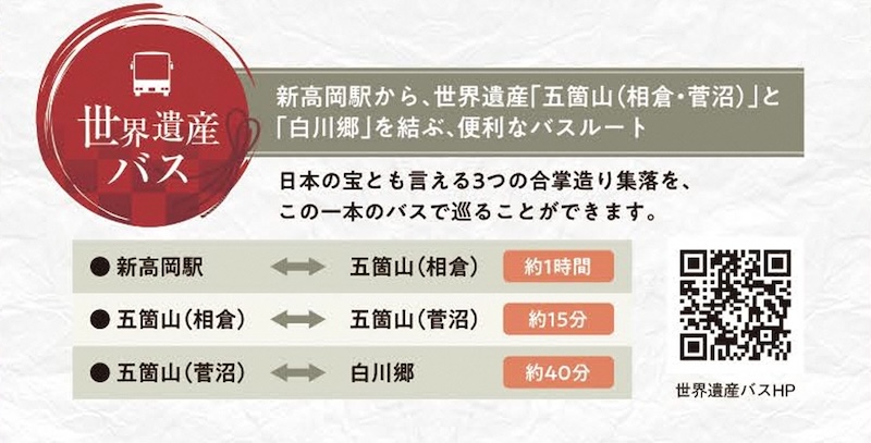 3つの世界遺産集落間を運行する「世界遺産バス」は1日4便。「五箇山・白川郷フリーきっぷ」もあります。