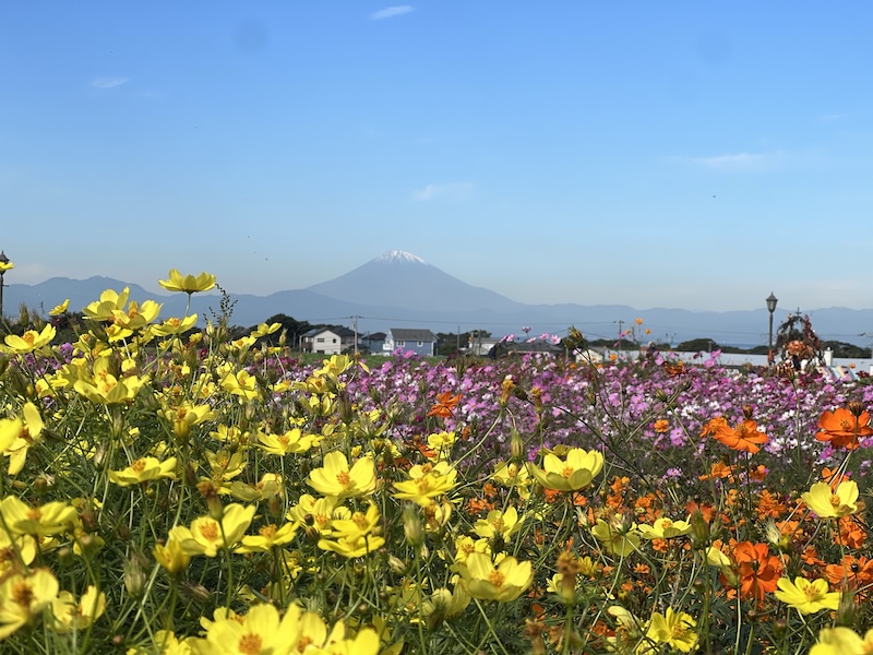 10月下旬からはオレンジ色と黄色のキバナコスモスと、ピンクと白色のコスモスが同時に見頃を迎え、一面に美しい景色が広がります。天候によっては、富士山を望むコスモスの絶景が楽しめます。