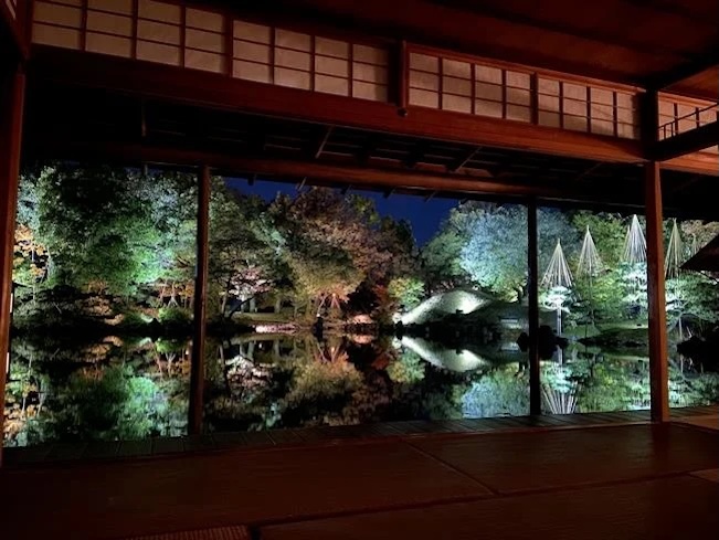 屋敷の中から鑑賞できます。池へのリフレクションも見所です。