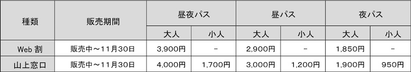 【料金】次頁、夜パスまたは昼夜パスのとおり