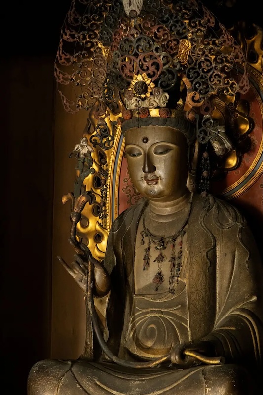 泉涌寺に伝わる重要文化財・楊貴妃観音像は、湛海律師が寛喜2年(1230)に請来した木像で、朱赤・金・深緑の彩色が約800年を経た今もなお鮮やかに残ります。美人祈願の観音さまとして多くの信仰を集め、今回の早朝拝観では内陣からの特別参拝と「心身美麗祈願」を行います。参拝記念として、楊貴妃がライチを好んだと伝わることから、緑寿庵清水「らいちの金平糖」をお持ち帰りいただきます。