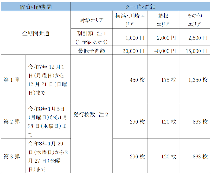 ・宿泊割引クーポンは3回に分けて発行し、それぞれ上限に達し次第終了となります。