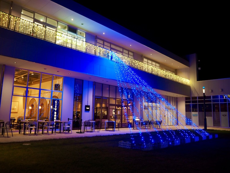 2階テラスと外階段に広がるゴールドのイルミネーション、そして2階から1階芝生広場へと流れ落ちる青い光のカーテンが、幻想的な光の世界を演出します。柔らかな光に包まれた空間で、笑顔あふれる冬のひとときをお過ごしください。
