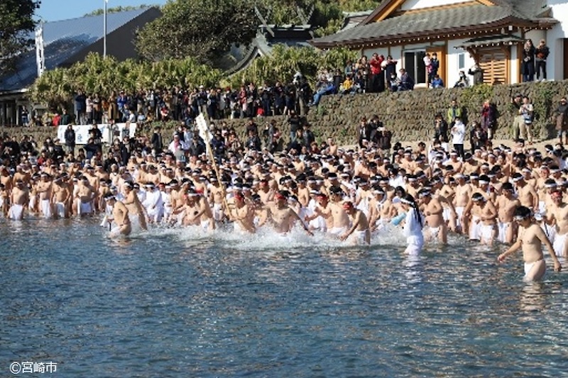 その昔、彦火火出見命(ひこほほでみのみこと)が、海神国から帰国された際、村の人々が衣服をまとう暇もなく赤裸の姿で取り急ぎお迎えしたという古事から起こったものです。寒風を突き海水の中で身を清める神事であるこの禊は、全国的にも珍しく貴重なものです。現在、神事は従来どおり残し、裸まいりのみそぎ行事だけ成人の日の祝日に合わせて開催されています。