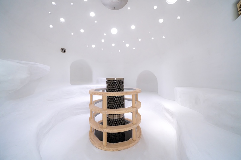 薬草スチームサウナ(女性):既存の女性スチームサウナを増設し、白を基調とした柔らかな空間。