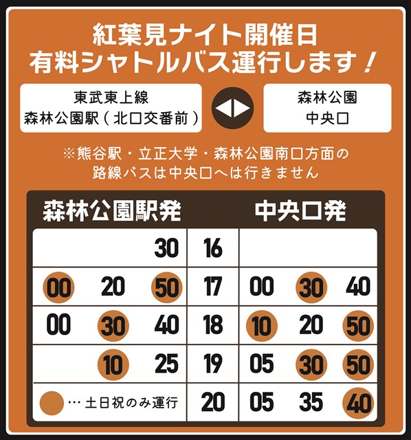 11/14(金)より、森林公園駅と会場の中央口を結ぶ夜間シャトルバスを運行します。公共の交通機関はございませんので、ぜひご利用ください。