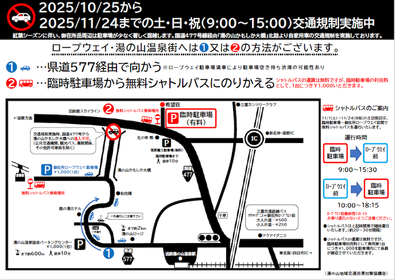 マイカーでお越しの方は臨時駐車場をご利用のうえ、シャトルバスで湯の山温泉・御在所ロープウエイ前までお越しください。スムーズに移動いただけます。