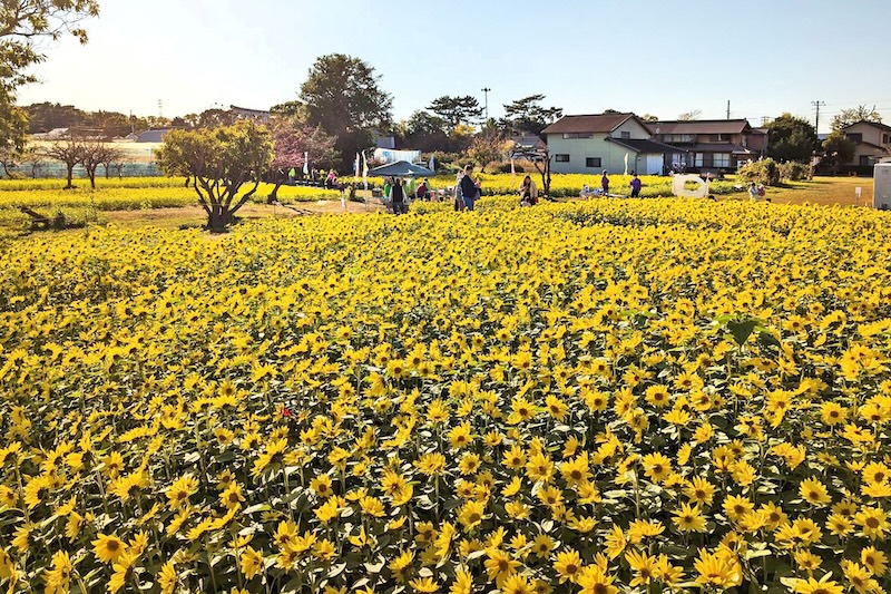 寒川神社南側の「さむかわひまわり畑」(寒川町宮山3922-5)では、約3000㎡に約10万本のひまわりが咲き誇ります。同会場で開催する「さむかわ冬のひまわりfestival」では、特設の見晴台からの眺望、記念撮影スポット、ひまわりの摘み取り体験を楽しめるほか、地場野菜やお土産等の販売を予定しています。