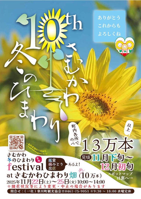 初冬の風物詩「さむかわ冬のひまわり」は、寒川町の温暖で穏やかな気候を活かし、冬に温もりを感じていただくことを目的に、2016年よりスタートしました。今年で10年目を迎え、今年は、「さむかわひまわり畑」と「川とのふれあい公園」の2会場で冬に咲くひまわりをご覧いただけます。