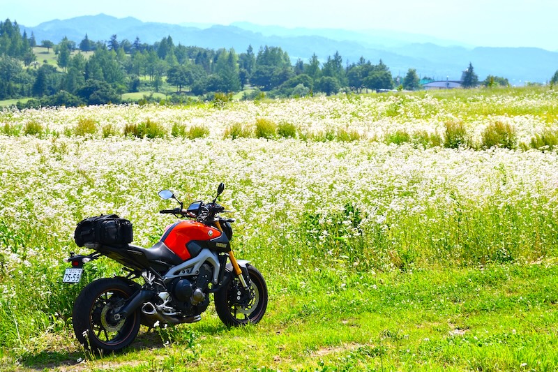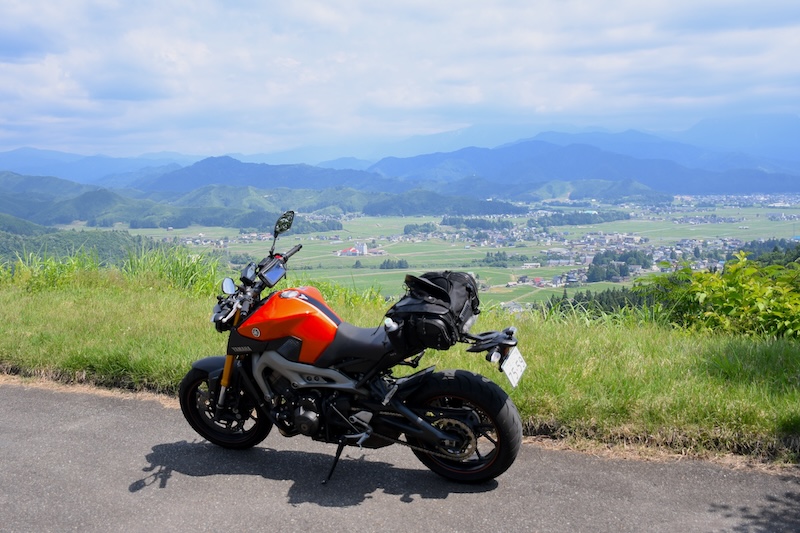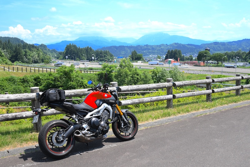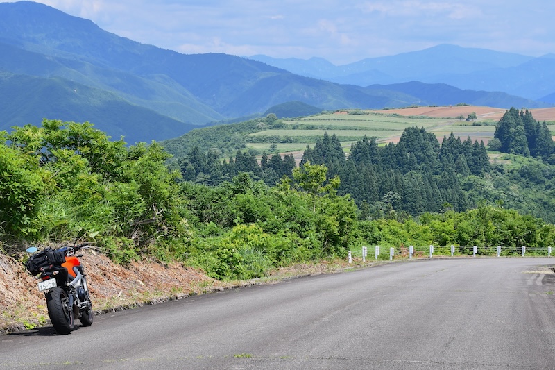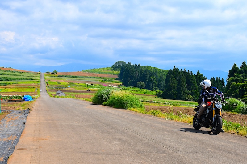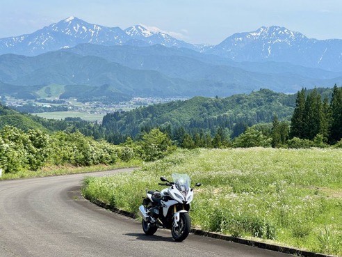 永林寺に立ち寄った後、根小屋花と緑と雪の里公園(展望デッキあり)から続く魚沼パノラマラインに入りました。実はこのラインは魚沼市観光協会が「魚沼パノラマライン」と名付けた10.3kmのルートで、魚沼市にも公認されています。魚沼市内の高台を走るこのほぼ二車線の道では、越後三山や花々を望みながら爽快な走りを楽しみことができます。そして、同ルートの最後(根小屋からスタートした場合)の場所で、北海道を思わせるような一本路を走ることができます。