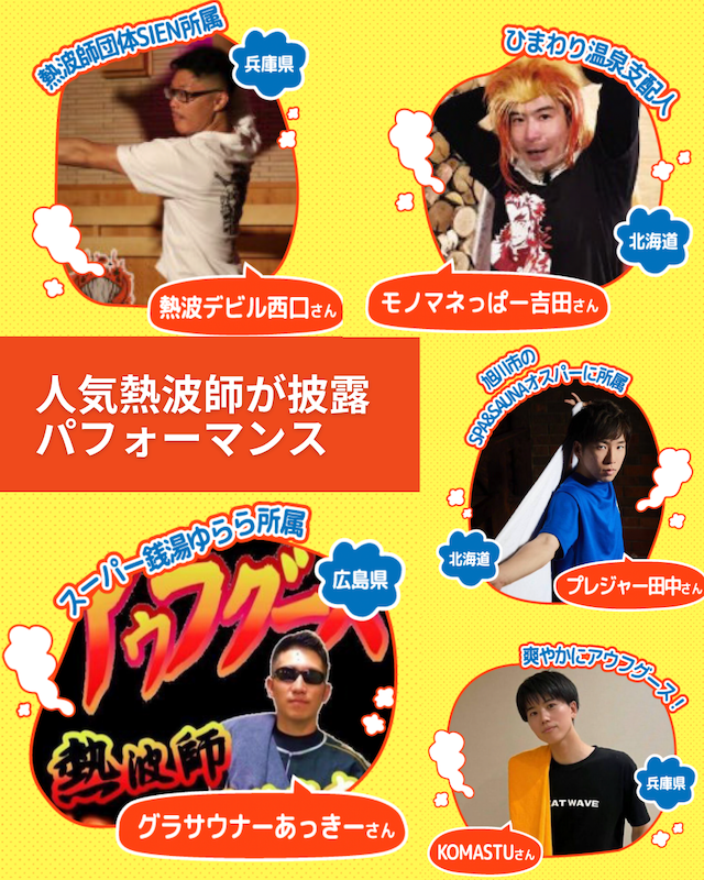 熱波師とは、サウナストーンから立ち上がる蒸気をタオルやうちわであおぎ、心地よい熱風(=熱波)を届けてくれるサウナのパフォーマーのこと。呼吸・リズム・香り・技術で魅せるその技はまさに“ととのいエンタメ”。本フェスでは、それぞれの個性あふれる熱波スタイルで究極のととのい体験へと導きます。